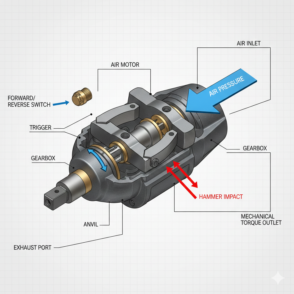 A szíve a pneumatikus ütvecsavarozó a légmotorja. Amikor a felhasználó meghúzza a ravaszt, a sűrített levegő belép a szerszámba, és megpörgeti a rotort. Ez a rotor egy "ütőmechanizmushoz" van csatlakoztatva – általában ikerkalapácsos vagy hintalós kivitelben. Ahogy a rotor forog, kinetikus energiát épít fel. Amikor a csavar ellenállása nagyobb, mint a motor forgóereje, a belső kalapácsok nekiütköznek a kimenő tengelynek (az üllőnek), és hirtelen, hatalmas forgóerőt hoznak létre. Ez percenként több száz vagy akár több ezer alkalommal történik.